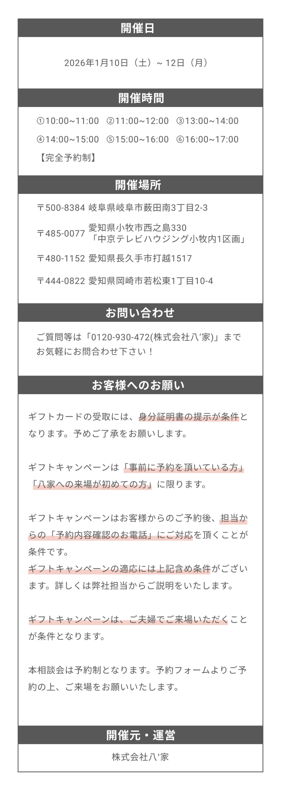 当日予約はお電話のみの対応となり、来場特典対象外となります。ご了承ください。