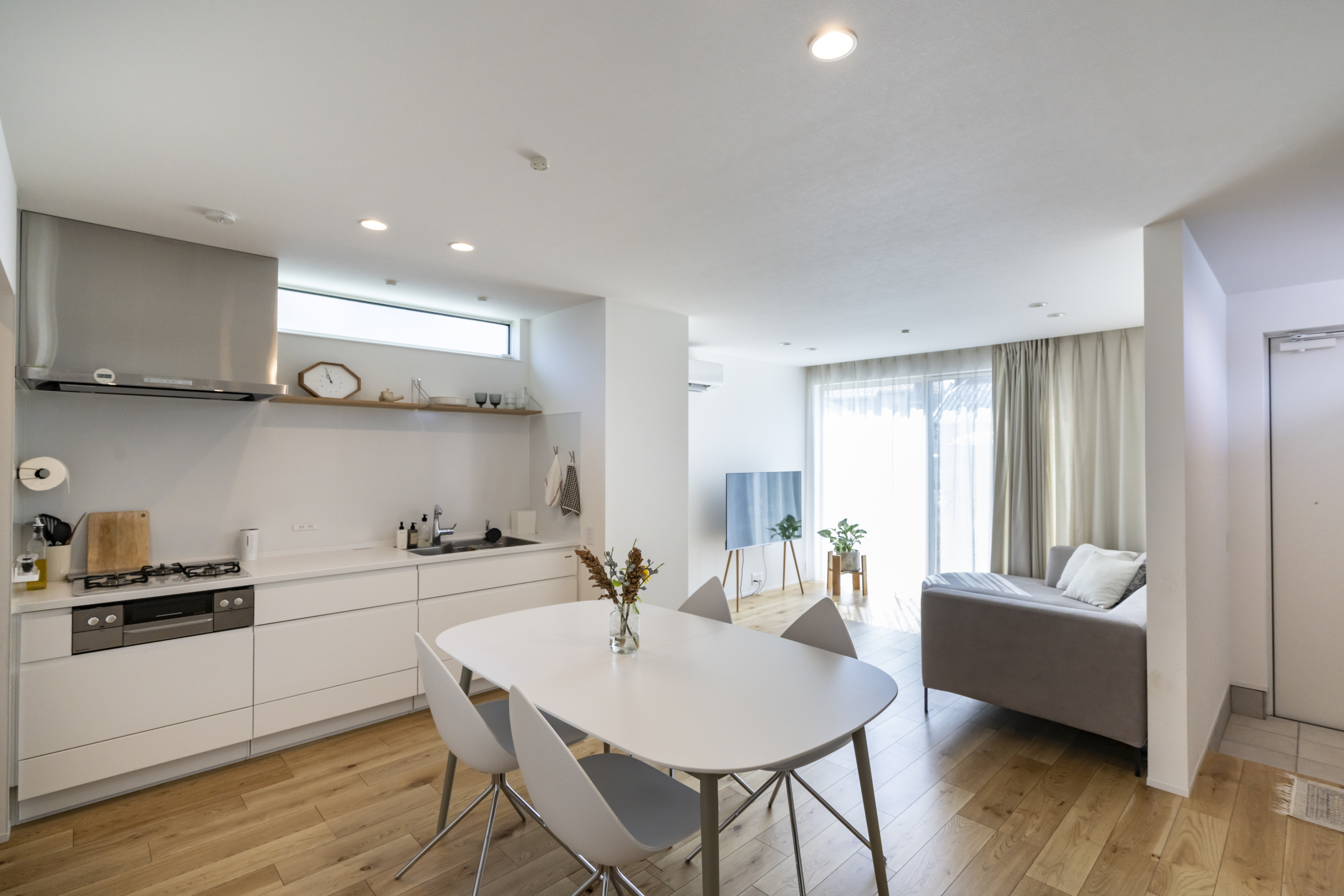 インテリアと合わせた白色のキッチンは壁付けに。ペニンシュラやアイランドよりも省スペースとなり、限られた空間でもLDKをより広く見せてくれます。ダイニングへの配膳も短い動線で済むので、壁付けキッチンは設計士もオススメしています。