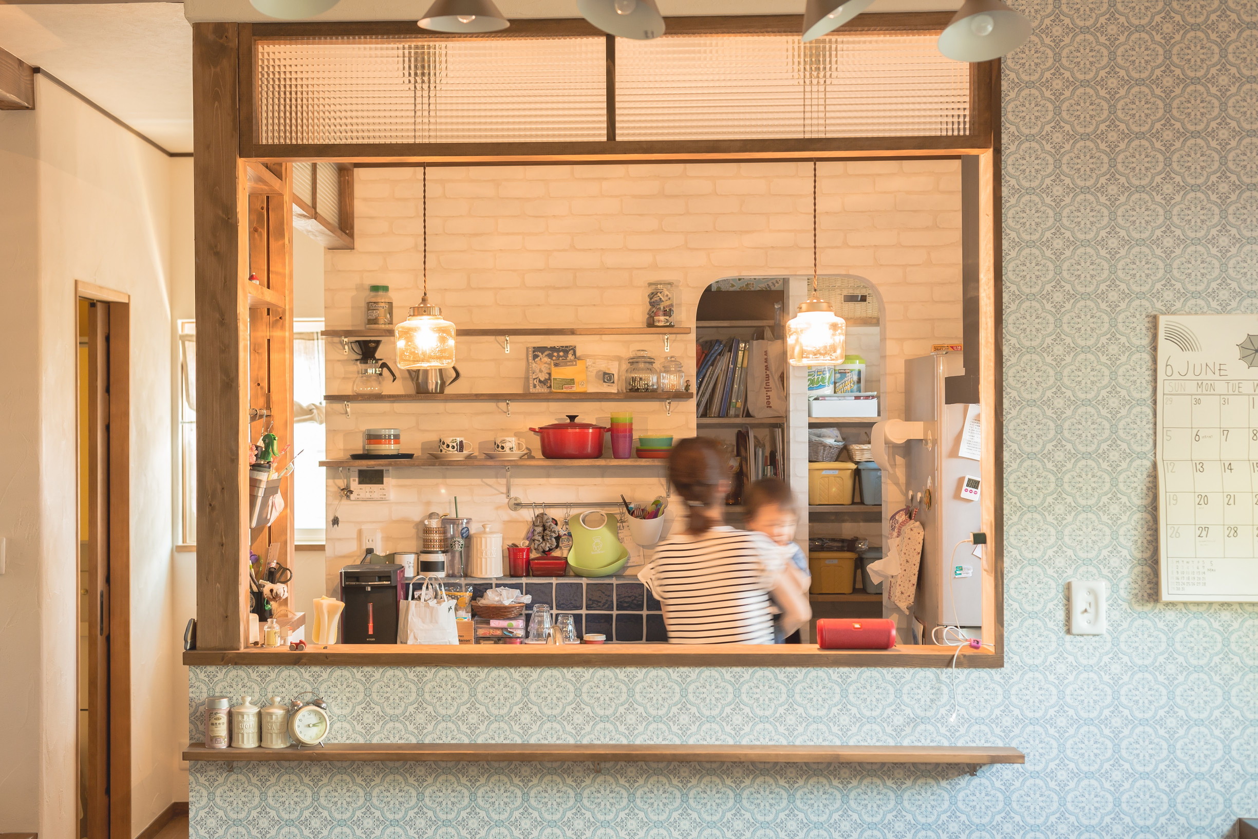塗値壁に無垢の床、板張りや水色の壁紙、アンティークな照明、個性豊かなアイテムで大人カントリーなLDKに。インテリアショップ「コロニアルチェック」のリネンカーテンは友達に褒められるそう