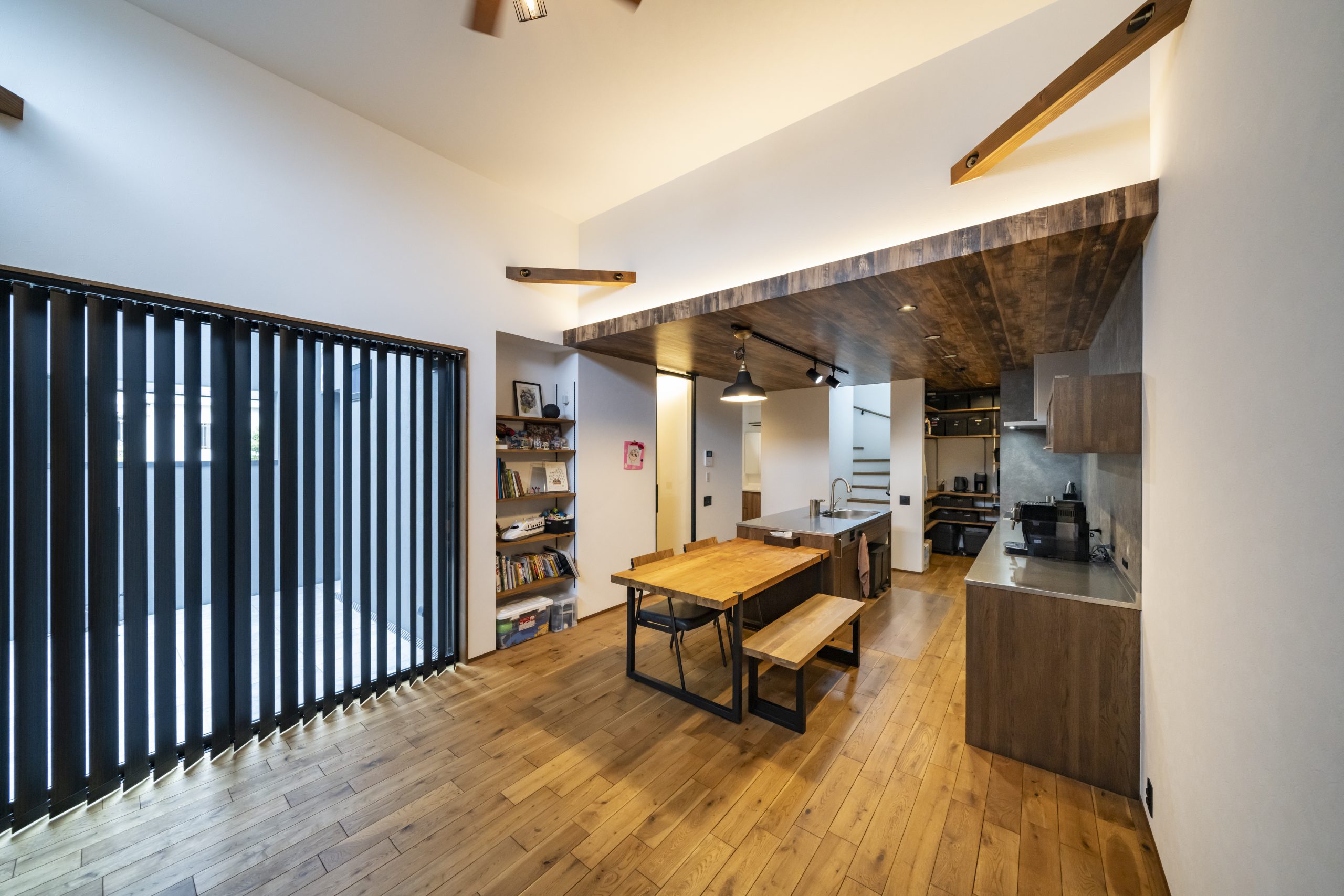 高天井に火打ち梁をあらわしにしたリビングは、下がり天井の木目が温かみを添え、居心地のよさを演出。