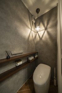 階段下という小さな空間を、光・形・用途の工夫で豊かに仕立てた一角です。