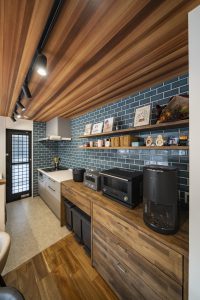 腰壁にも木目を採用し、カップボード背面のブルーグリーンのタイルが彩りを添え、機能性とデザイン性が調和した上質なダイニングキッチンに仕上がっています。
