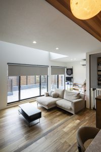 ダウンフロアに設けられたリビングは、吹き抜けを通じて2階のホールとつながる、家族の中心となる空間です。