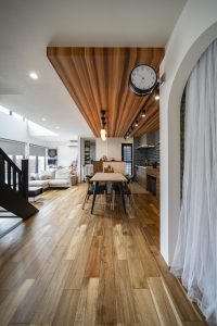 キッチンの天井を一段下げ、木目クロスでアクセントを加えることで、空間に落ち着きと奥行きを演出しています。