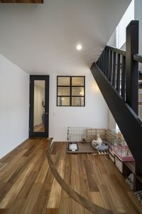 リビングとを隔てる壁の室内窓やガラス張りのドアからは視線が抜け、わんちゃんがお出迎えしてくれることで、暮らしの温かさと開放感を同時に感じられる玄関空間です。