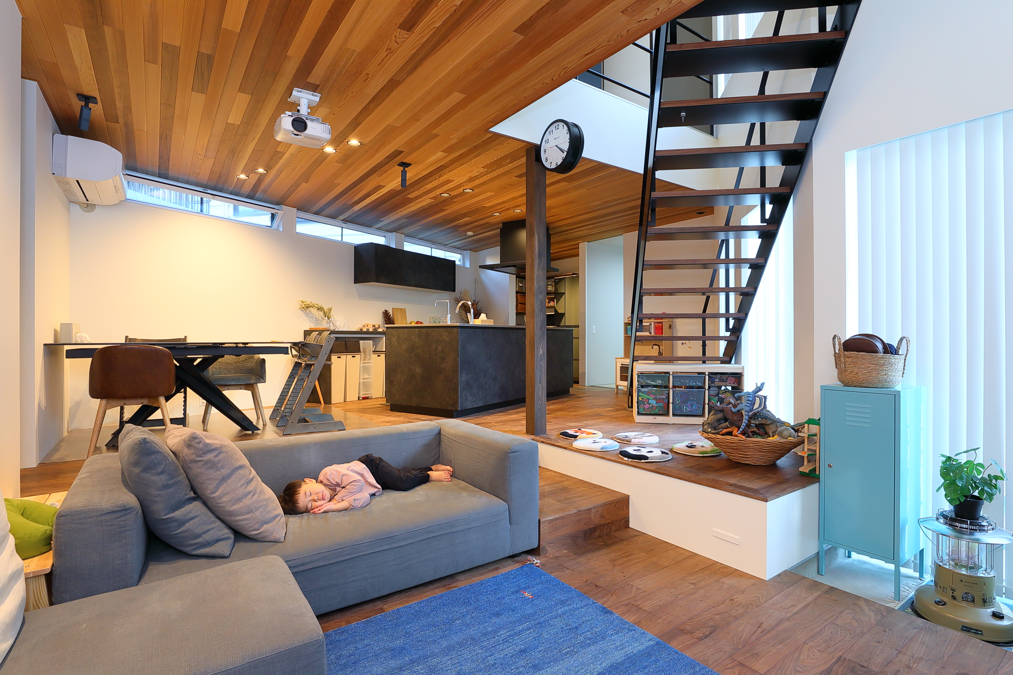 リビングはダウンフロアにして、空間にメリハリを。持ち込みのソファがピッタリ納まるよう設計されています。