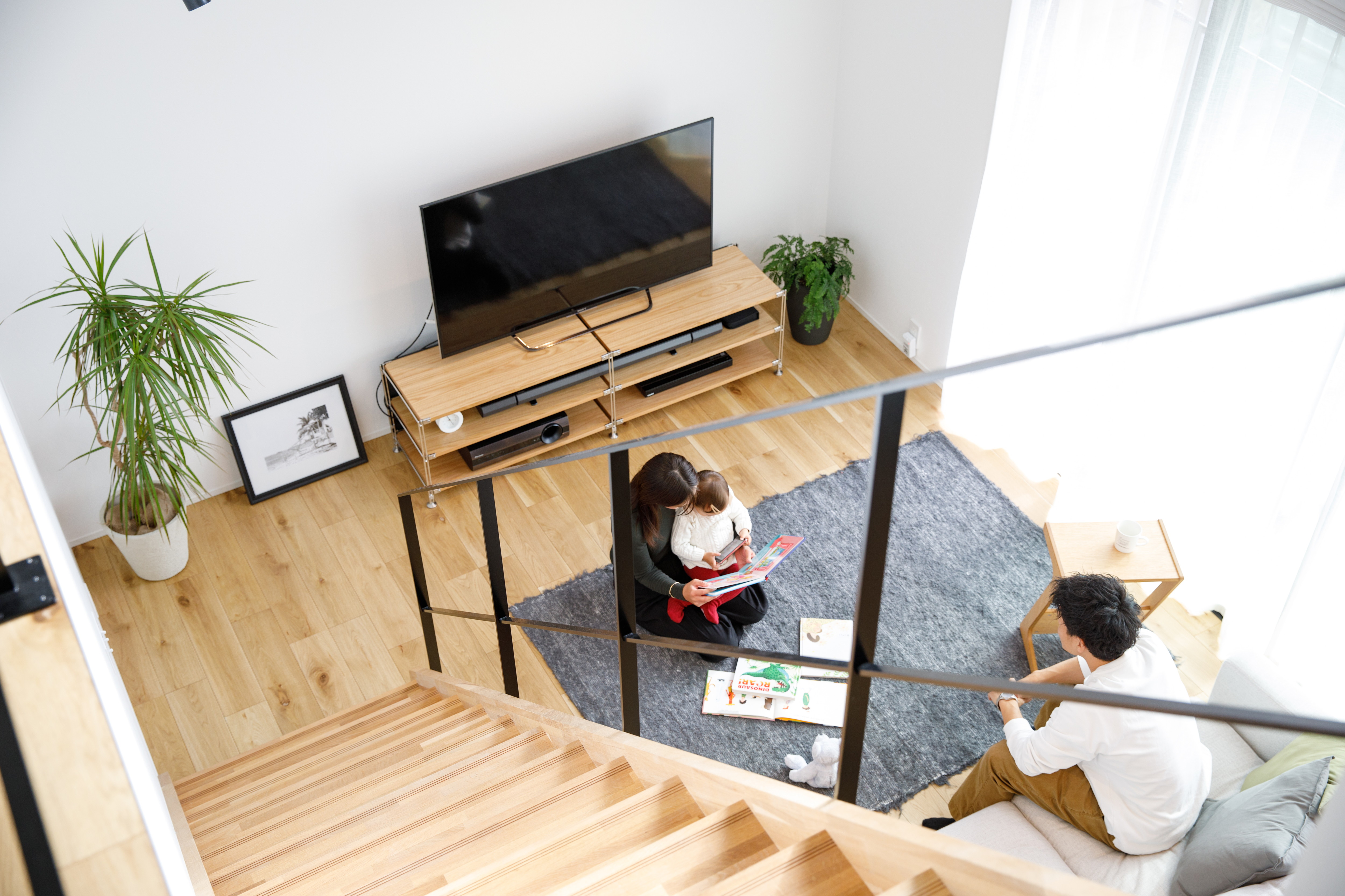 吹き抜けや窓配置を工夫することで、開放的に仕上がったリビング。大きな掃き出しや高い位置にある窓から、たっぷりお日様の光が差し込みます♪梁にはダクトレールを取り付け、オーナー様自身で自由に照明を増やしたり減らしたりできるようになっているのもポイント。
