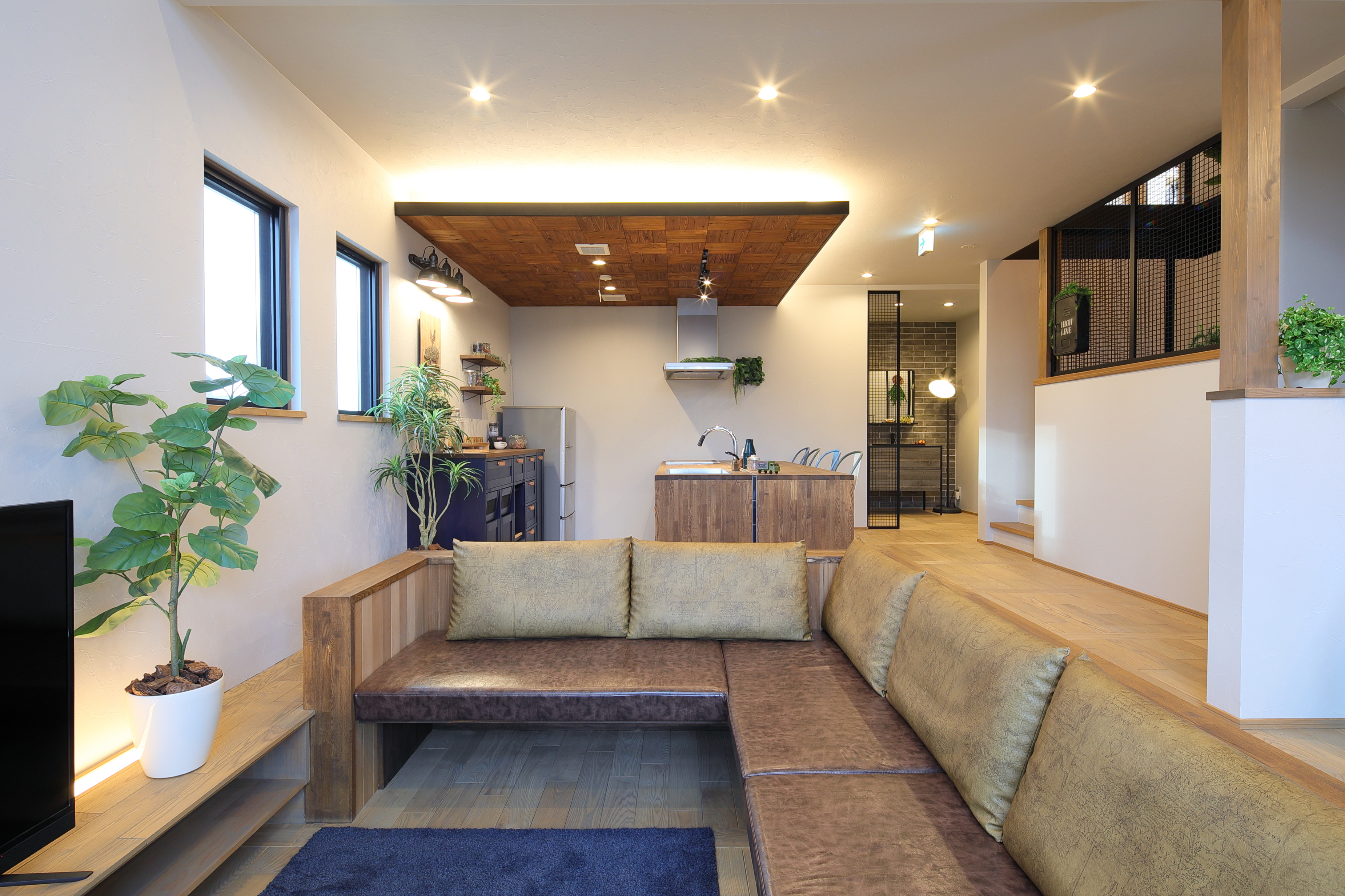 床を1段下げたリビングには、大工さんお手製のオリジナル造作ソファが。木目のグラデーションの美しいこちらのソファは、座面にもへりにも腰掛けられるのがポイント。
