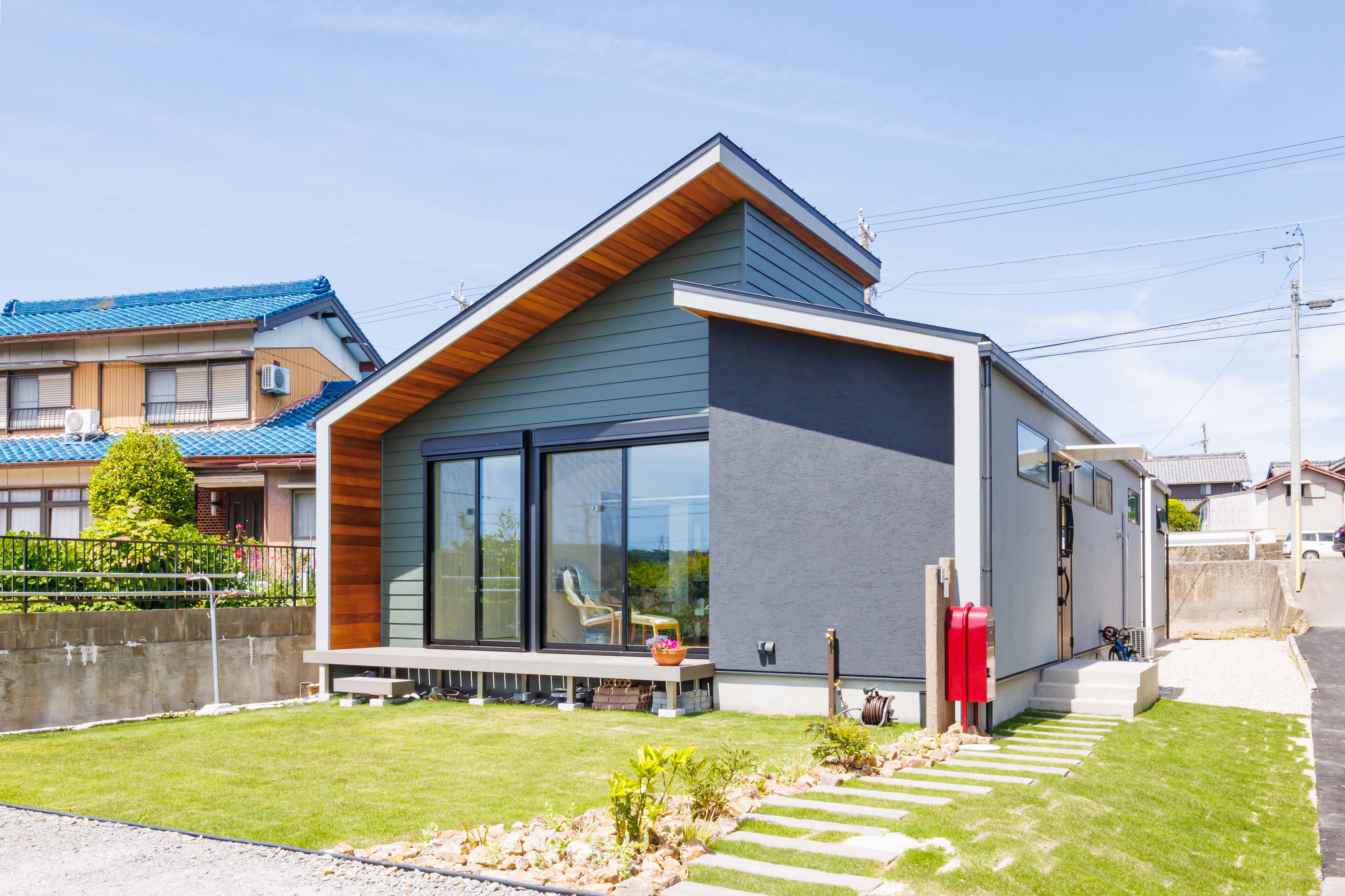 無骨な印象になりやすいガルバリウム鋼板に、塗り壁と木材を組み合わせることでナチュラルテイストの外観に。高さ違いの屋根や凹凸のある形状が立体感を演出してくれます。
